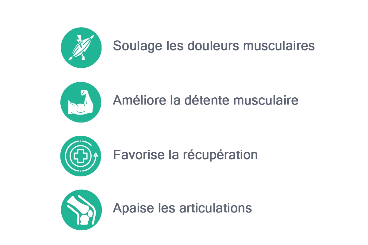 - Il favorise la récupération rapide après l'effort, aidant à réduire les courbatures et les inflammations.