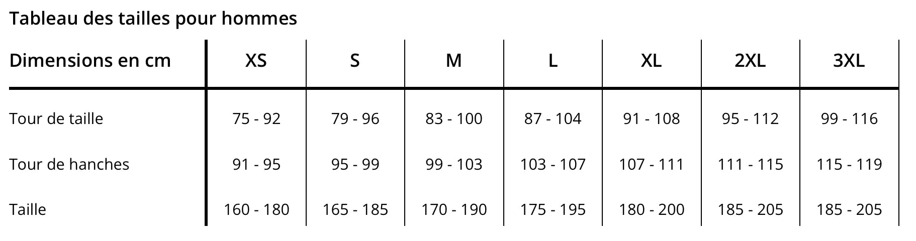 ⚠️Attention : Selon le tableau guide des tailles ci-dessus, nous conseillons de sélectionner une taille au-dessus pour un ajustement optimal et un confort maximal.